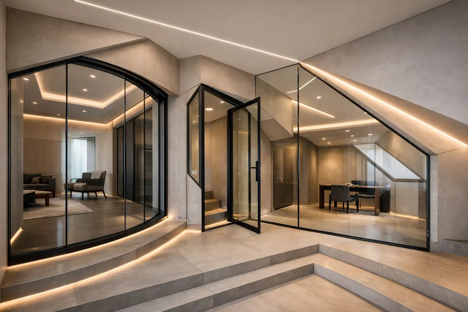 Ob unter Treppenläufen, in Dachschrägen oder bei außergewöhnlichen Raumachsen – ANGULIS PRIME verbindet technische Präzision mit gestalterischer Eleganz. Das System eignet sich ideal für exklusive Wohnräume, Büros und Sonderprojekte, bei denen Standardlösungen nicht ausreichen und maßgeschneiderte Glasarchitektur gefragt ist.