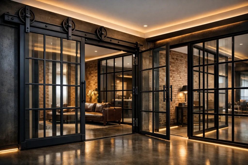 FORGEA LOFT steht für kraftvolle Glastrennwände im Industrial Look, bei denen sichtbare Mechanik und architektonische Klarheit bewusst in Szene gesetzt werden. Das robuste Stahlrahmen-Design mit klassischem Schiebetürbeschlag und offen geführten Laufrollen verleiht dem Raum eine authentische, handwerklich geprägte Anmutung.