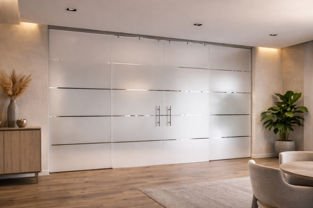 Die zweiflüglige Schiebetür mit fein abgestimmter Satinierung schafft flexible Raumübergänge und eignet sich ideal für hochwertige Wohn- und Arbeitsbereiche. Das reduzierte Design fügt sich harmonisch in moderne Architektur ein und unterstreicht den Anspruch an Präzision, Funktionalität und zeitlose Ästhetik.