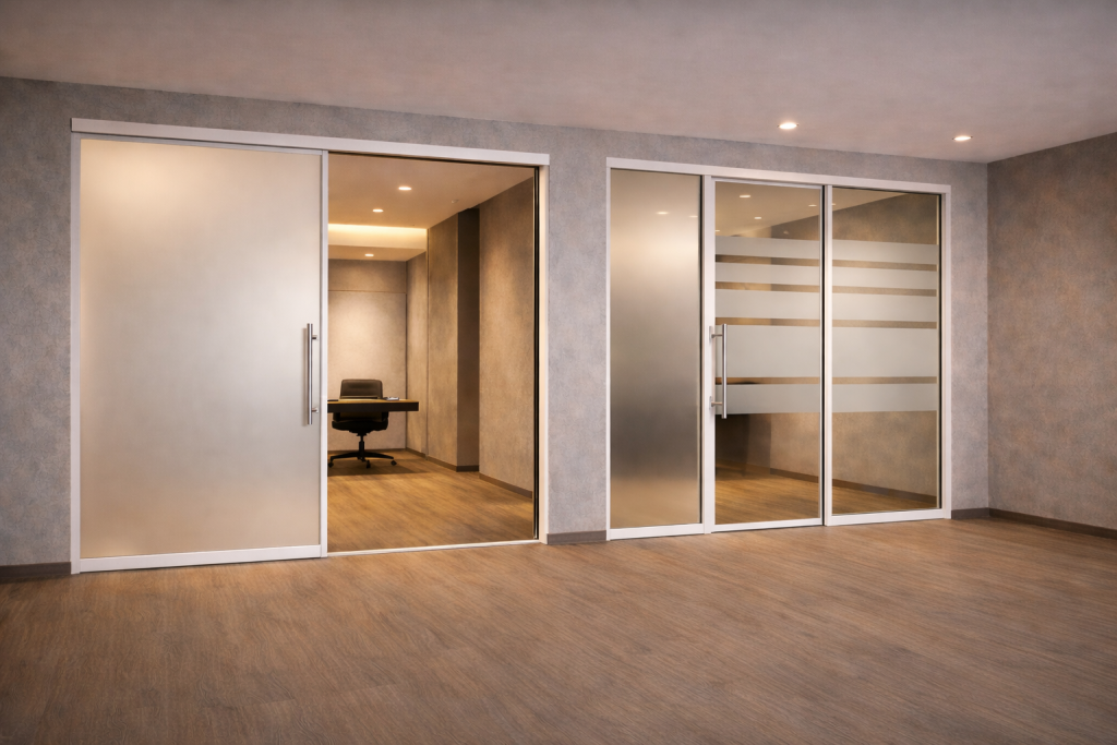 Filigrane Profile, klare Glasflächen und eine ruhige Linienführung sorgen für eine hochwertige architektonische Wirkung. Die integrierte Satinierung schafft gezielten Sichtschutz, ohne den Raum optisch zu schließen, und unterstützt eine ausgewogene Lichtführung. Ideal für moderne Büros, Kanzleien und anspruchsvolle Wohnkonzepte, bei denen Design, Komfort und Funktionalität im Einklang stehen.