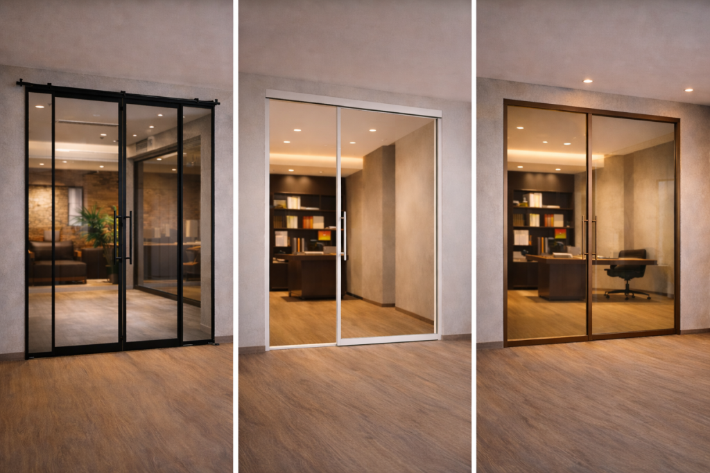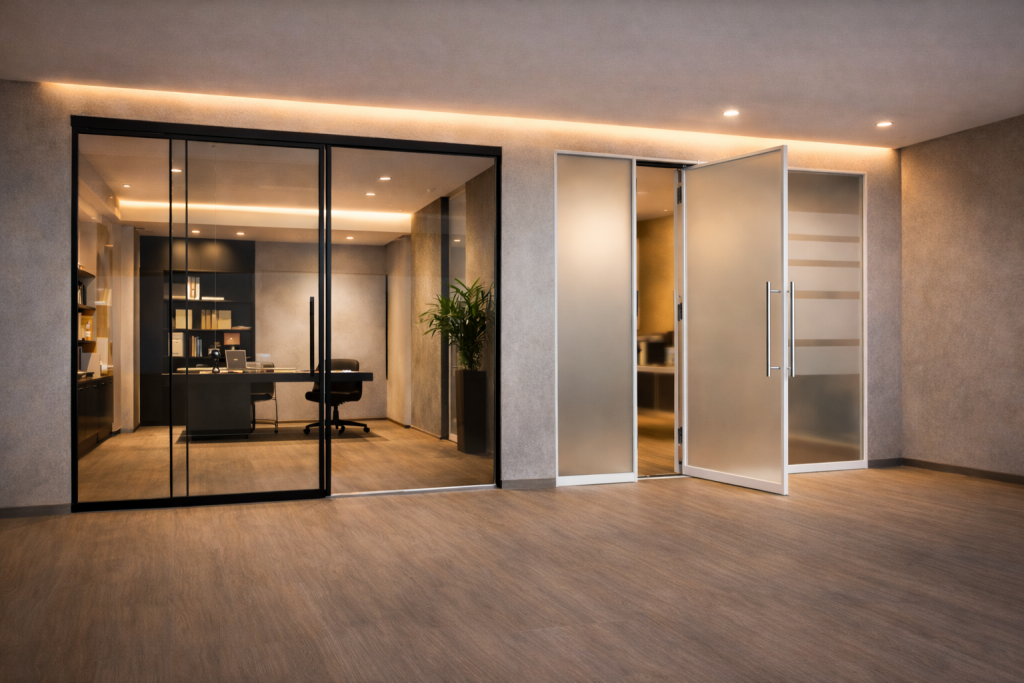 Großformatige Glasflächen ermöglichen eine optimale Lichtdurchlässigkeit, während die integrierte indirekte Beleuchtung die Architektur subtil akzentuiert und eine hochwertige Raumwirkung erzeugt. Die präzisen geführten Beschläge und klaren Linien machen LUMENORA FRAMELESS zur idealen Lösung für anspruchsvolle Büro-, Kanzlei- und Objektbereiche, in denen Transparenz, Funktionalität und Design im Einklang stehen.
